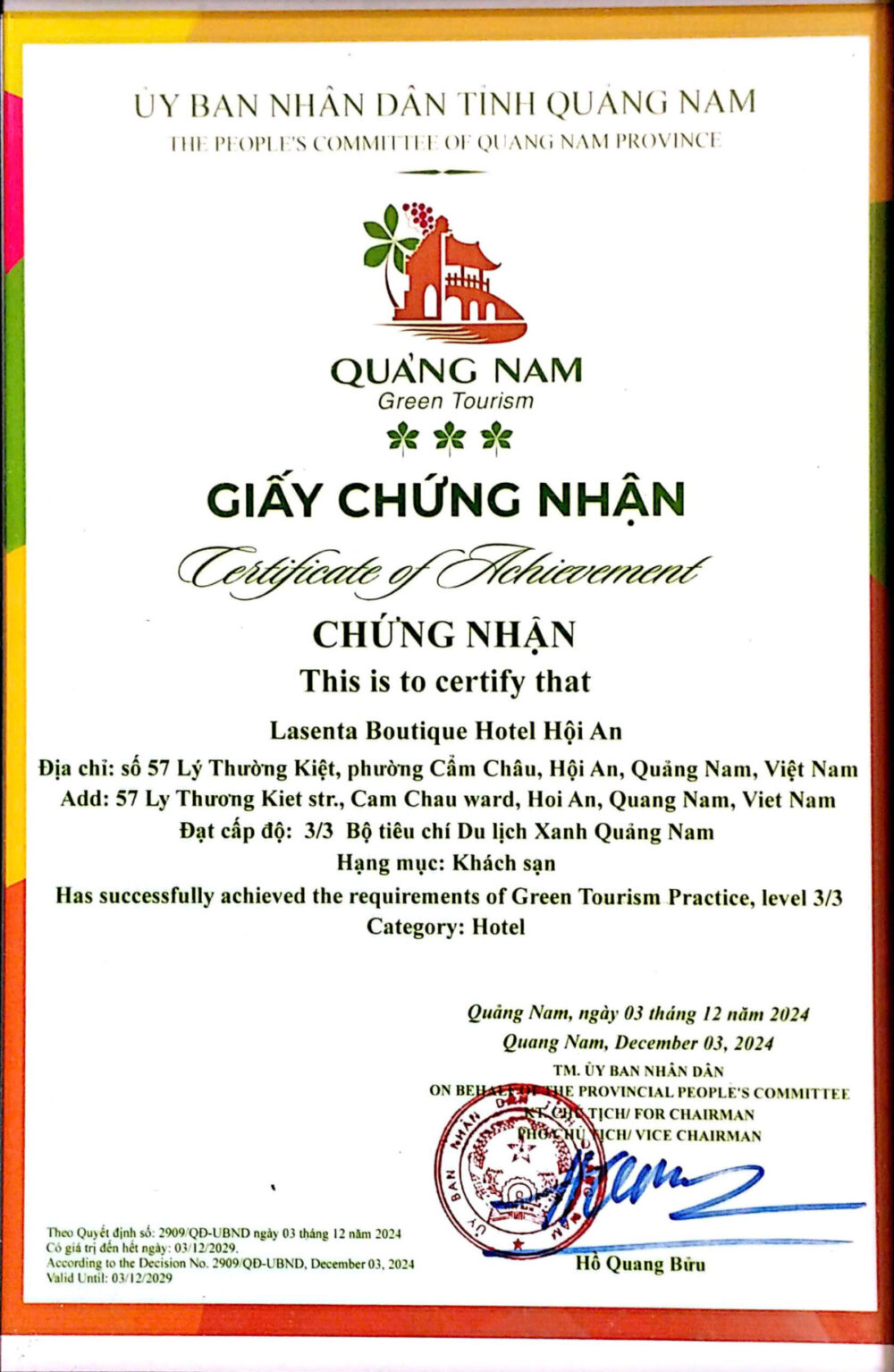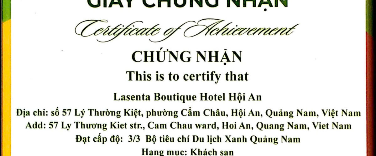 Đã đạt được các yêu cầu của Thực hành Du lịch Xanh, cấp độ 3/3. Hạng mục: Khách sạn
