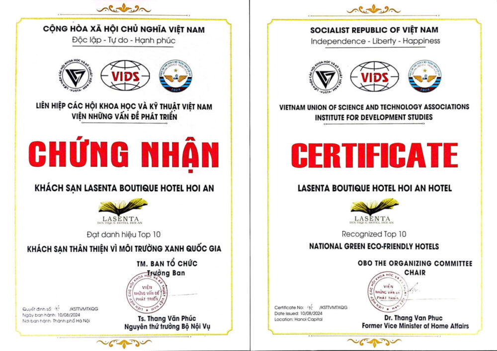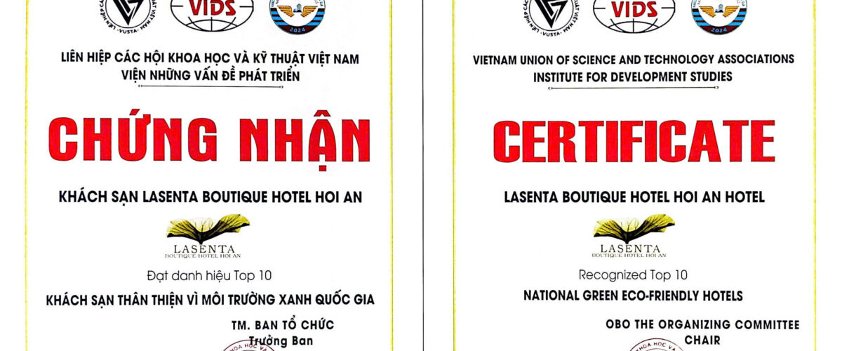 Với niềm tự hào và cam kết không ngừng nghỉ hướng đến một tương lai bền vững, chúng tôi rất vinh dự được trao tặng Giải thưởng Khách sạn Xanh Thân thiện với Môi trường Quốc gia – minh chứng cho những nỗ lực không ngừng của chúng tôi trong việc kết hợp dịch vụ khách sạn đẳng cấp thế giới với trách nhiệm bảo vệ môi trường.